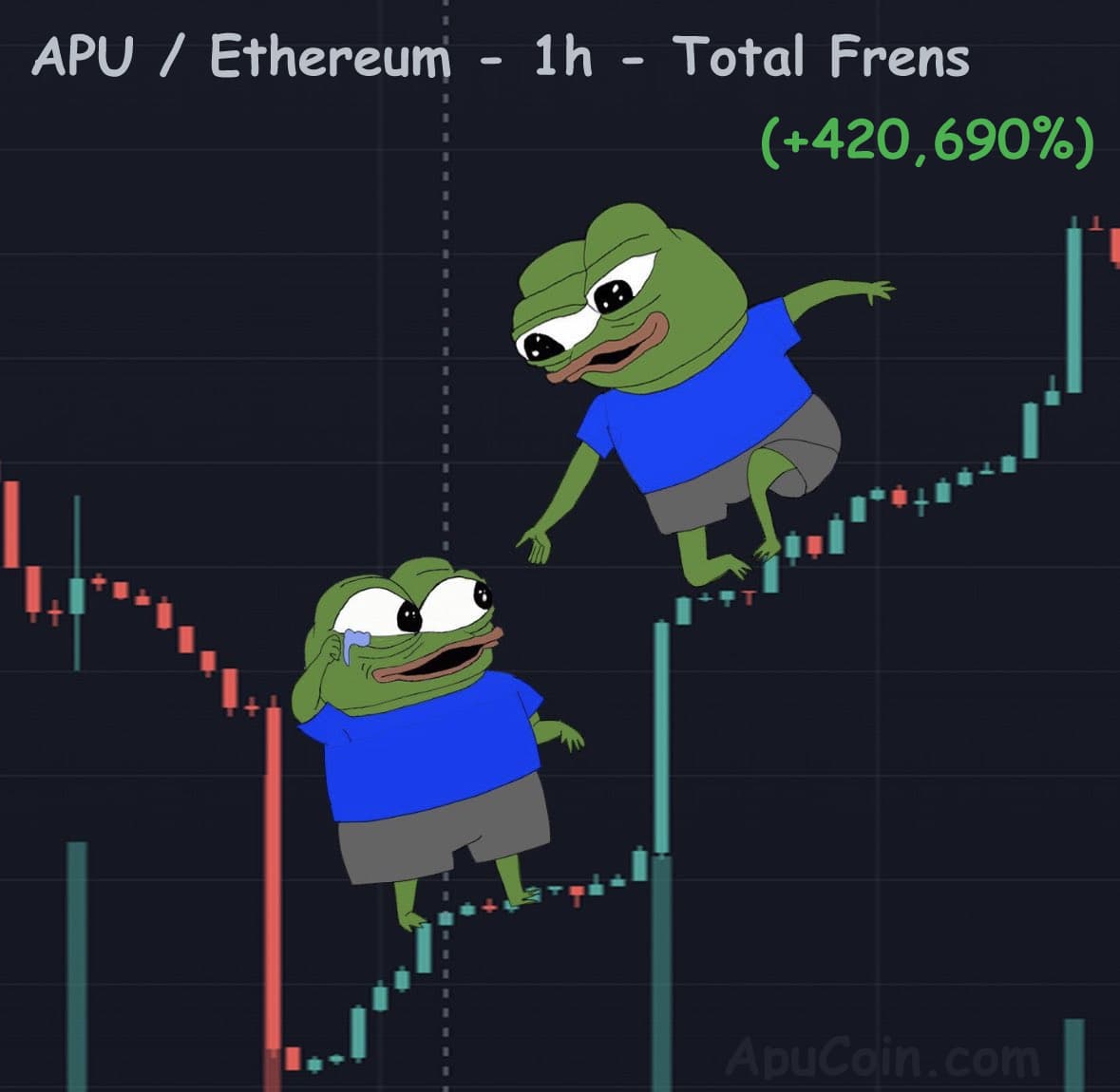 Apu, also known as Help Helper or Peepo, is a poorly drawn green frog, loosely inspired by Pepe the Frog. He is a younger, kinder, and more naive anthropomorphic frog. Popularized on image boards such as 4chan, Apu has become the most famous meme used in the cryptosphere.